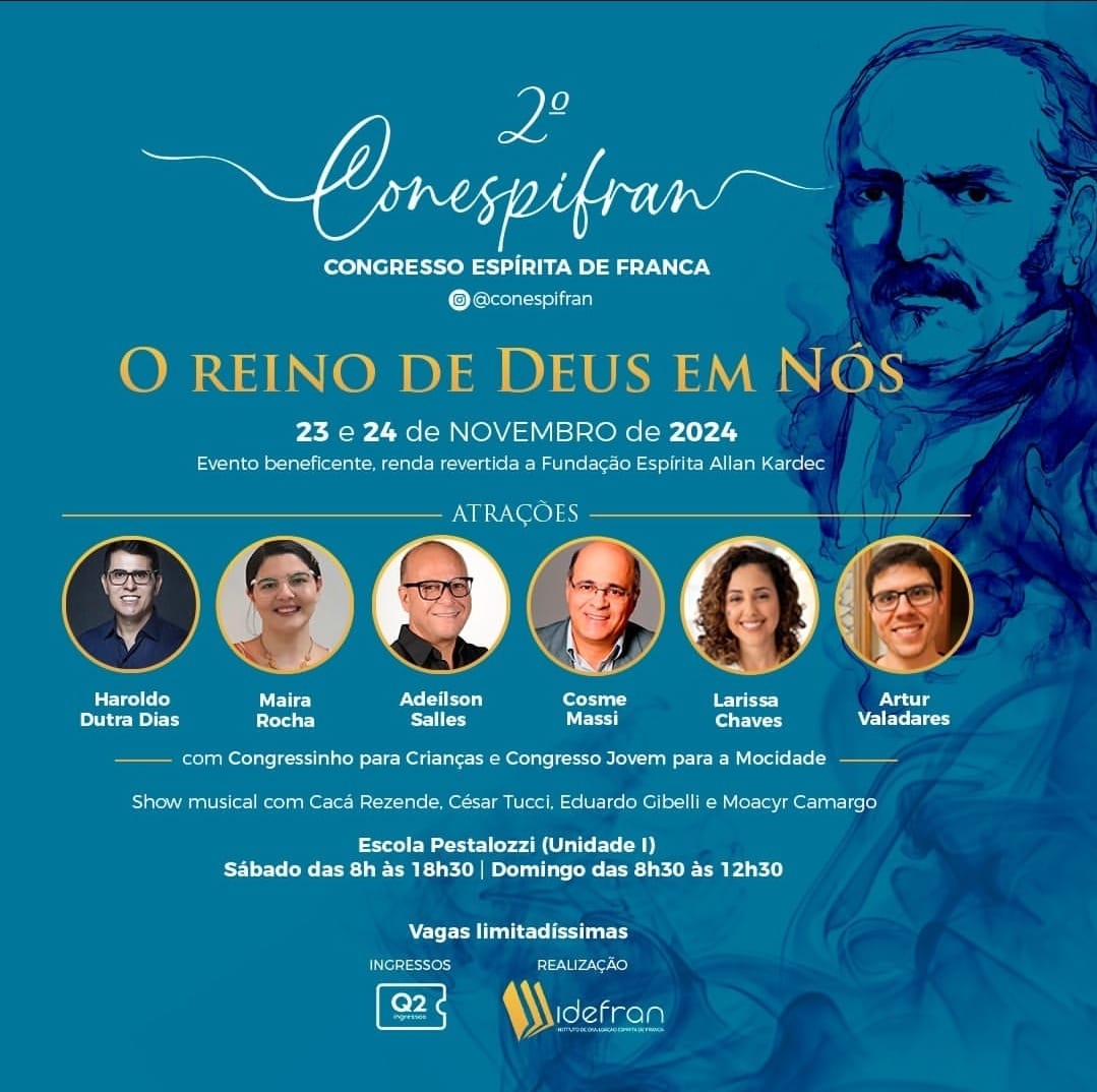 Novembro/2024 - O movimento espírita francano promoverá neste fim de semana, nos dias 23 e 24 de novembro, o 2º Conespifran (Congresso Espírita de Franca), que reunirá nomes expressivos da Doutrina. O evento, aberto ao público em geral, terá como tema central “O reino de Deus em nós”.