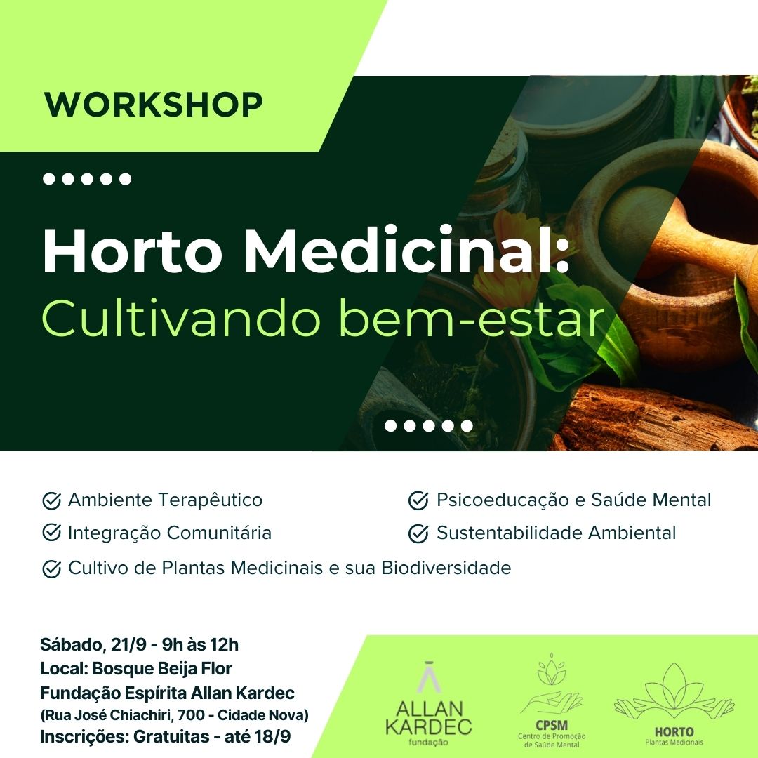 A Fundação Espírita Allan Kardec realiza neste sábado, 21, o workshop "Horto Medicinal: Cultivando o Bem-Estar", das 9h às 12h, no Bosque Beija-Flor, localizado na própria sede da instituição. O evento tem como objetivo apresentar o projeto e discutir temas como o cultivo de plantas medicinais, terapia natural, sustentabilidade e saúde mental.